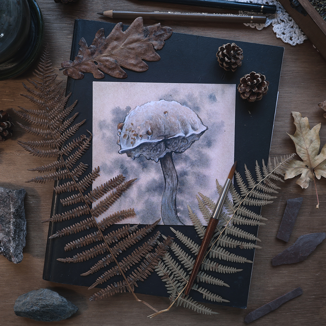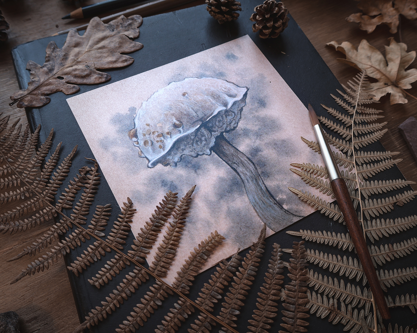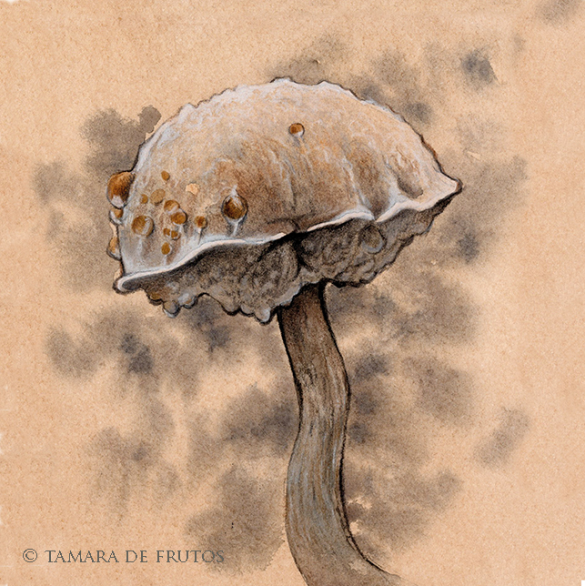 Impresión que reproduce la ilustración original de una pequeña seta otoñal del género Boletus, encontrada entre la hojarasca de un húmedo bosque.