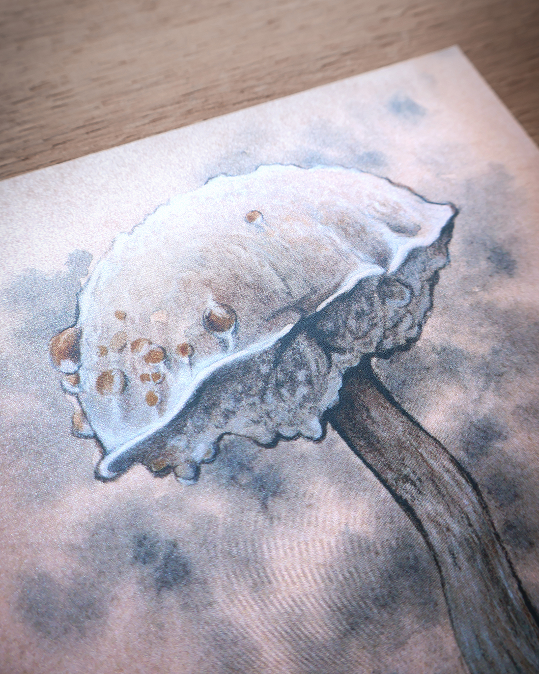 Pintado a mano con acuarelas y lápices de colores, e impreso sobre papel nacarado de 300 gr. Con el reflejo de la luz se aprecia el acabado brillante, que le da un toque mágico.