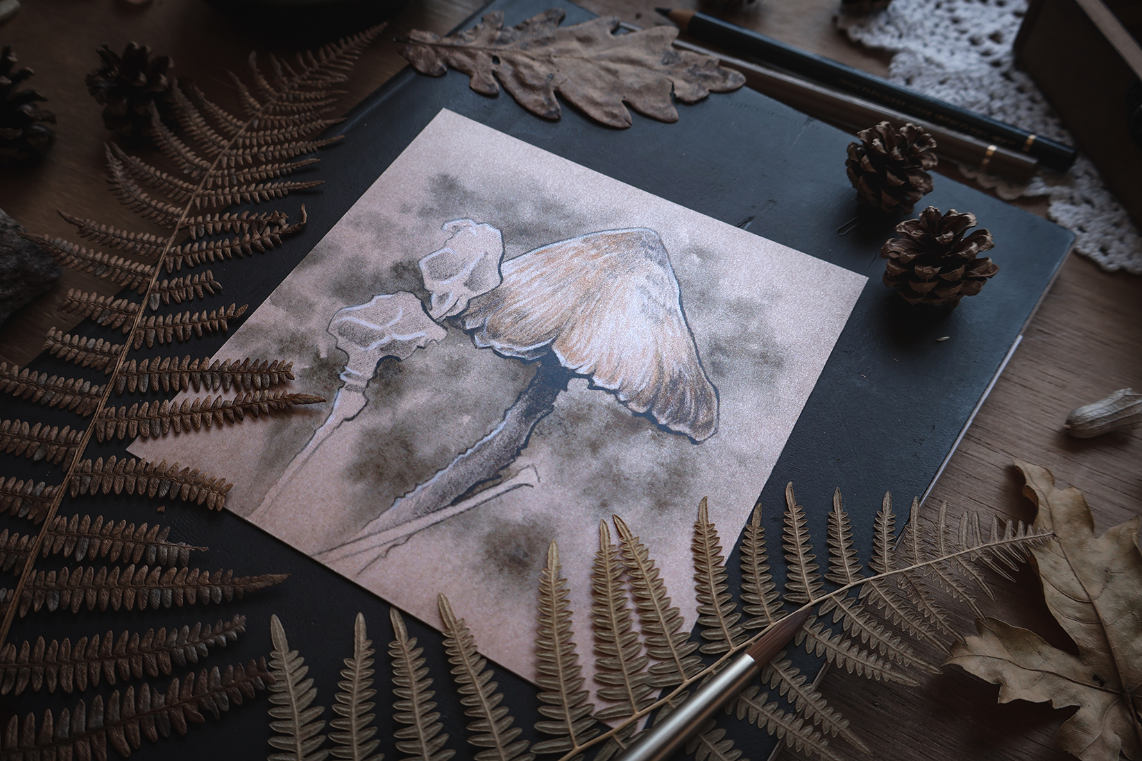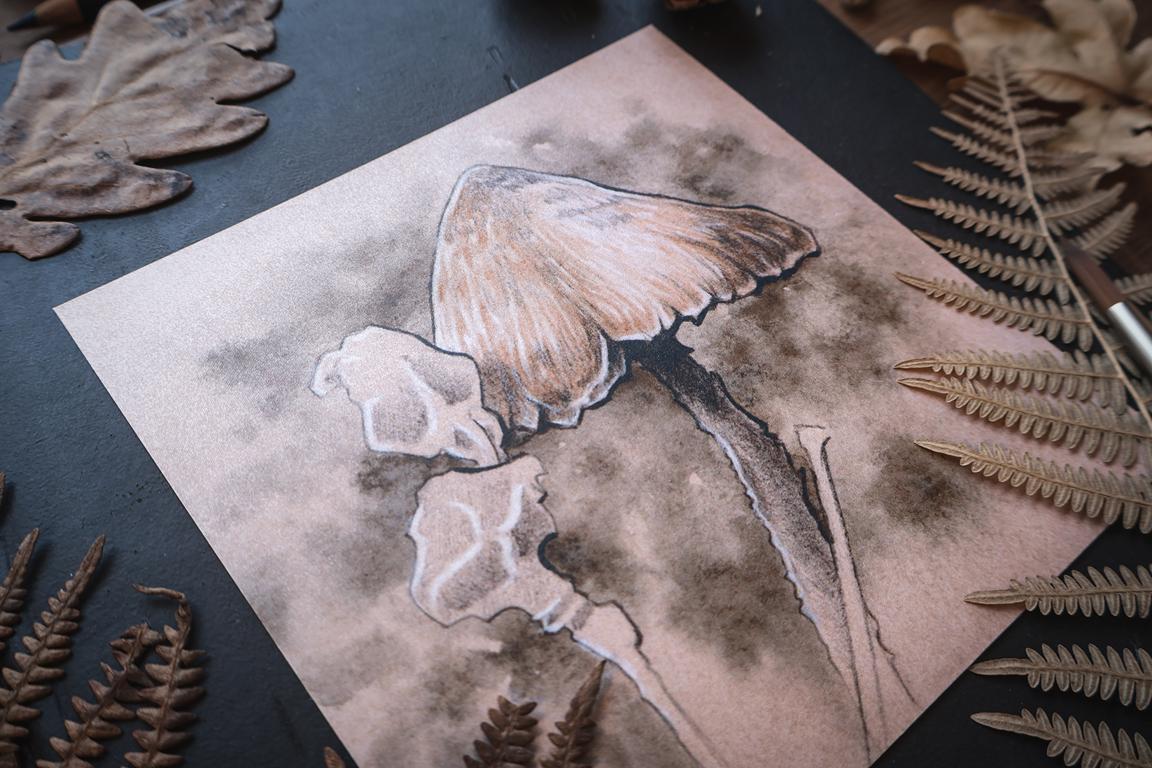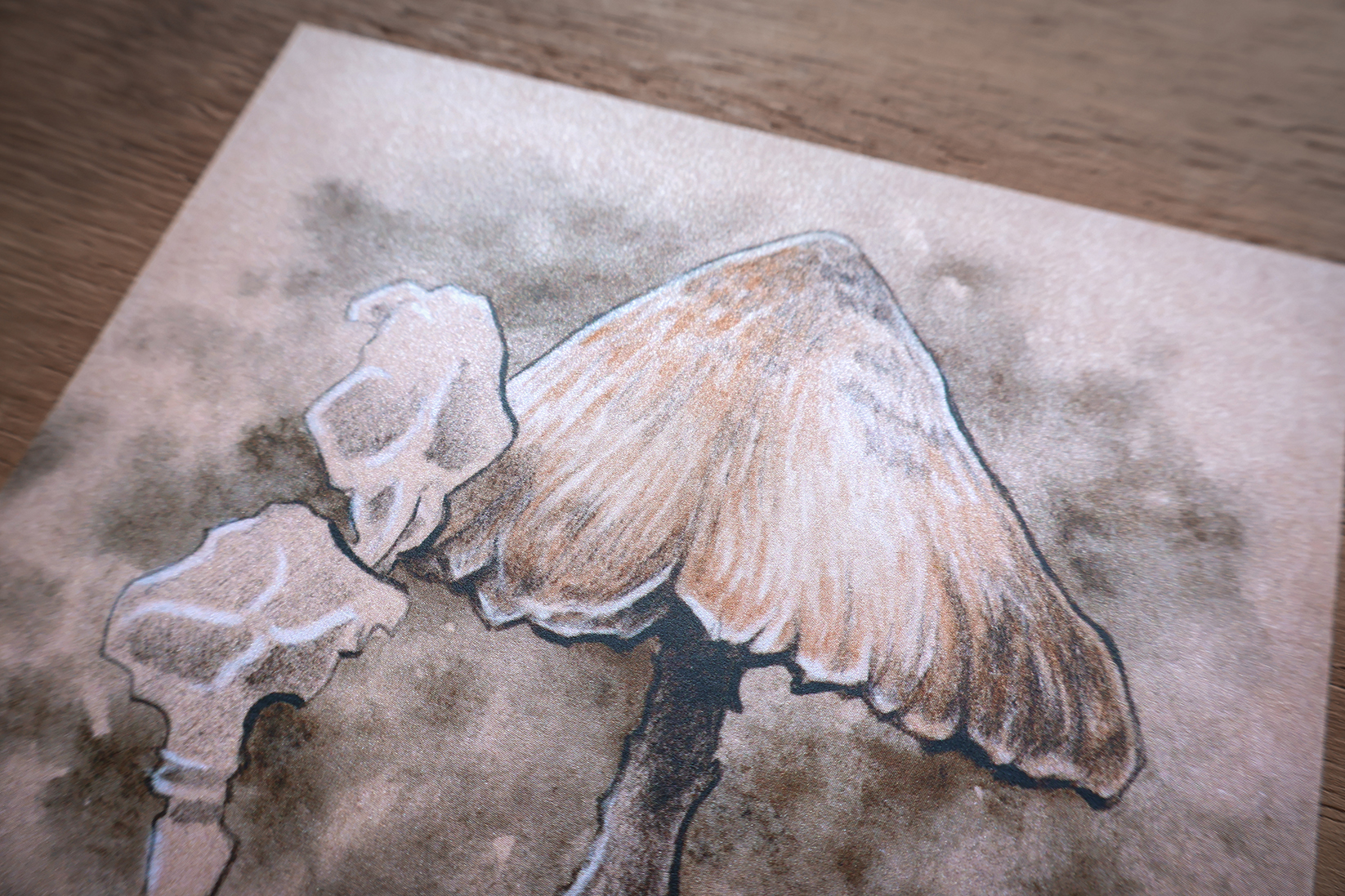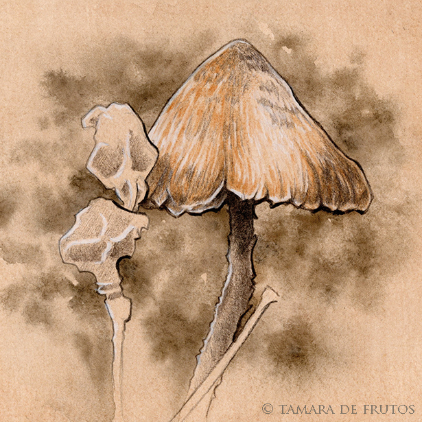 Pequeña impresión que reproduce la ilustración original de un viejo hongo del género Psilocybe, encontrado entre la hojarasca de un húmedo bosque.