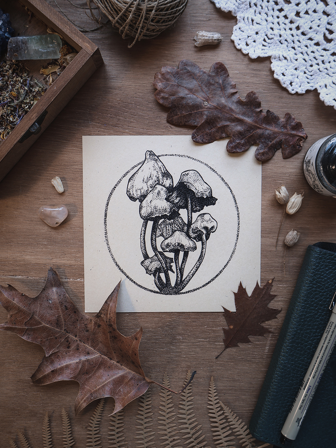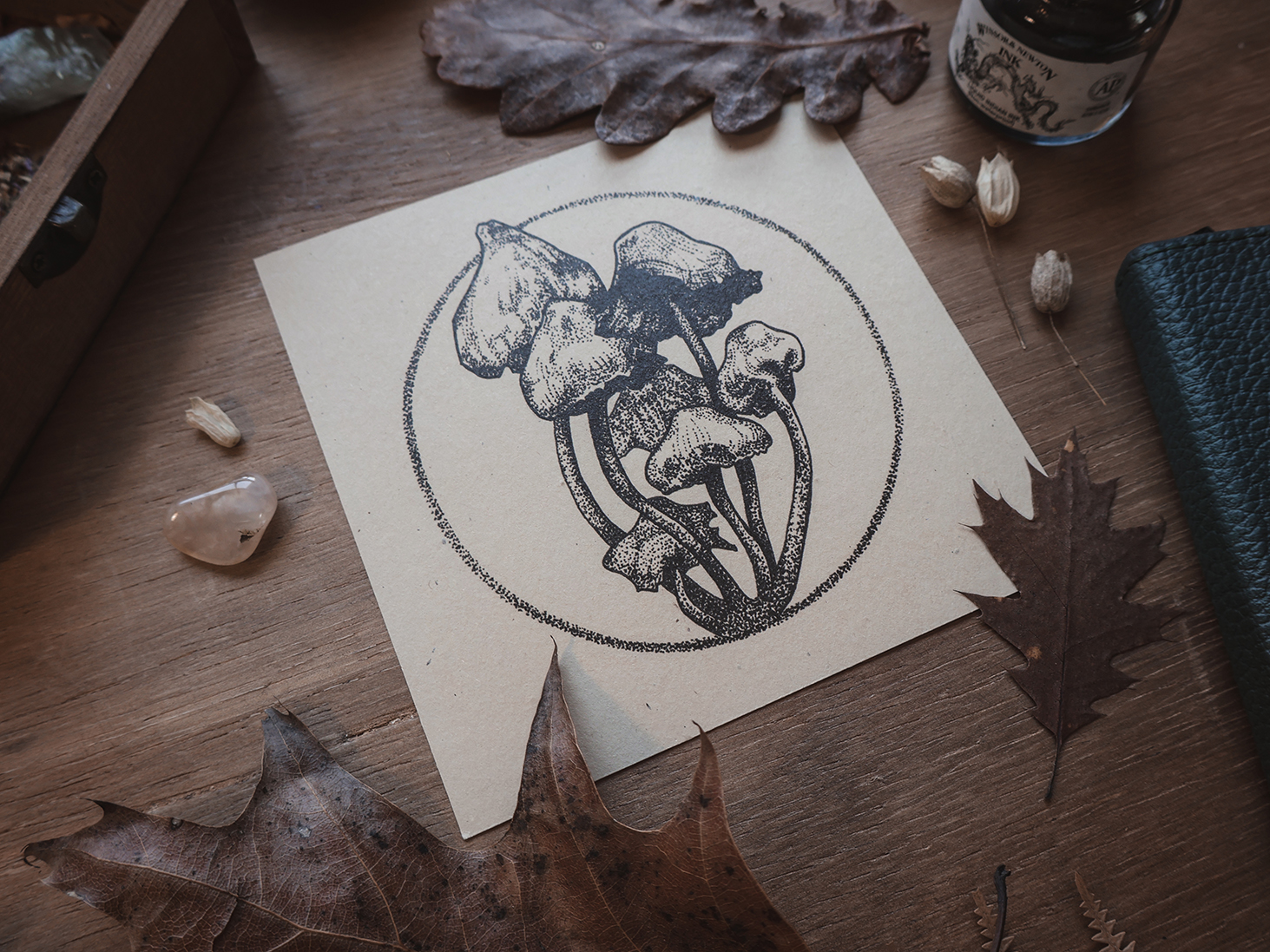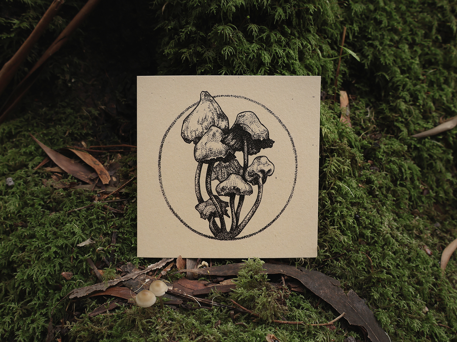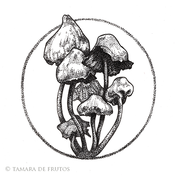 Esta impresión reproduce el dibujo original a tinta de un grupo de Psilocybe semilanceata. También llamadas monguis o liberty caps, son unos hongos del género psilocybe. Crecen en praderas y páramos donde abundan los verdes pastos, en climas húmedos entre la niebla, y son conocidos por inducir viajes psicodélicos de lo más singulares.
