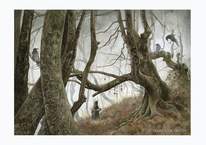 Impresión que reproduce la acuarela original de un bosque sagrado oculto entre la niebla. Hubo un tiempo en que los bosques constituían un lugar de encuentro espiritual, un templo donde rendir culto a las entidades divinas y entregar nuestras ofrendas, para recibir el favor de los espíritus del territorio. Tiempo de druidas y de santuarios llamados nemeton, de árboles sagrados y plantas aliadas. Quedan pocos que veneren estas entidades, y todavía menos de aquellas viejas arboledas.